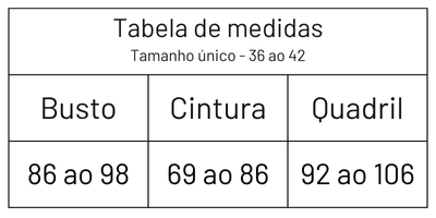 Busto 90 cm | Cintura 69 cm | Quadril 100 cm | Coxa 61 cm | Altura 1,66 m